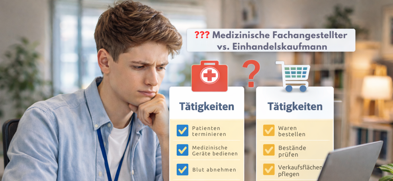 Erweitern wir das Beispiel. Stell dir vor, du vergleichst Kaufmann im Einzelhandel mit Krankenpfleger. Kaufmann: Regale auffüllen, Kunden helfen, Kasse bedienen – Werkzeuge: Scanner, Regalwagen, PC. Krankenpfleger: Patienten waschen, Medikamente geben, Vitalwerte messen – Spritze, Blutdruckmessgerät, Bett. Deine Stärken: Empathie hoch? Pflege gewinnt. Verkaufstalent? Einzelhandel.
