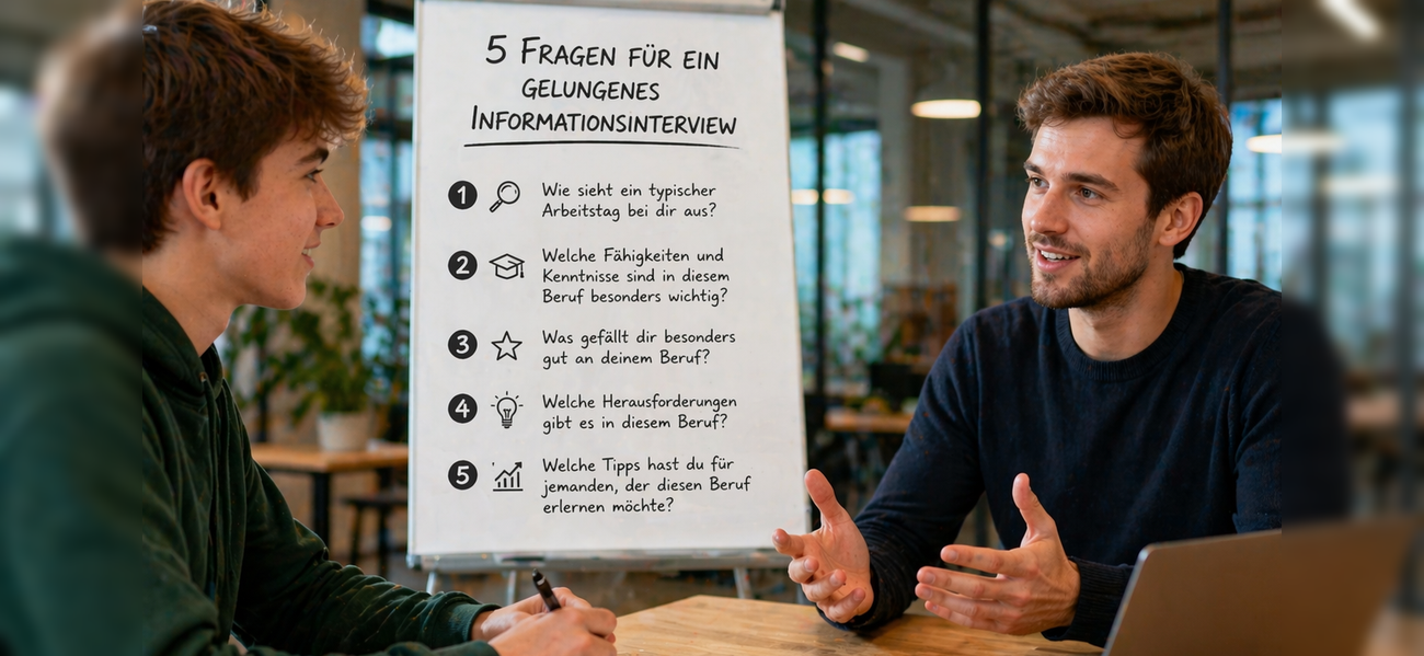 Bei "Schule! und nun?" unterstützen wir dich genau dabei. Unser crossmediales Konzept aus Magazin, Website und Social Media gibt dir Tipps, Einblicke und Kontakte. In diesem Beitrag stellen wir dir fünf starke Fragen vor, die sich auf Werdegang, Alltag, Anforderungen, Lernkurve und Bewerbungstipps konzentrieren. Sie sind einfach zu stellen, bringen aber tiefe Einblicke. Wir erklären jede Frage, warum sie sinnvoll ist, und geben Beispiele, wie du sie einsetzen kannst. So gehst du selbstbewusst in dein erstes Gespräch – und kommst mit Klarheit raus.
